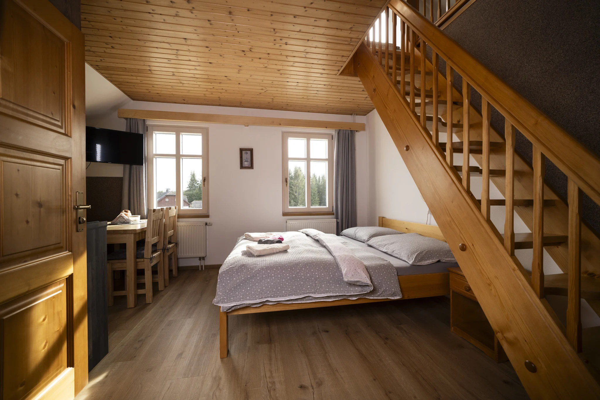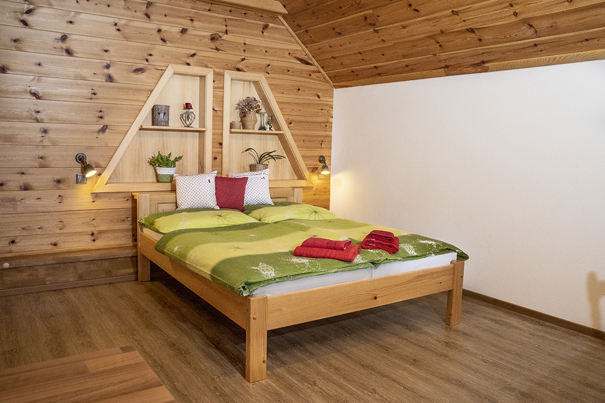 Apartmán tvoří 2 lůžkový pokoj s kuchyňkou a TV, mimoúrovňový 3 lůžkový pokoj, sociální zařízení se sprchovým koutem a WC.